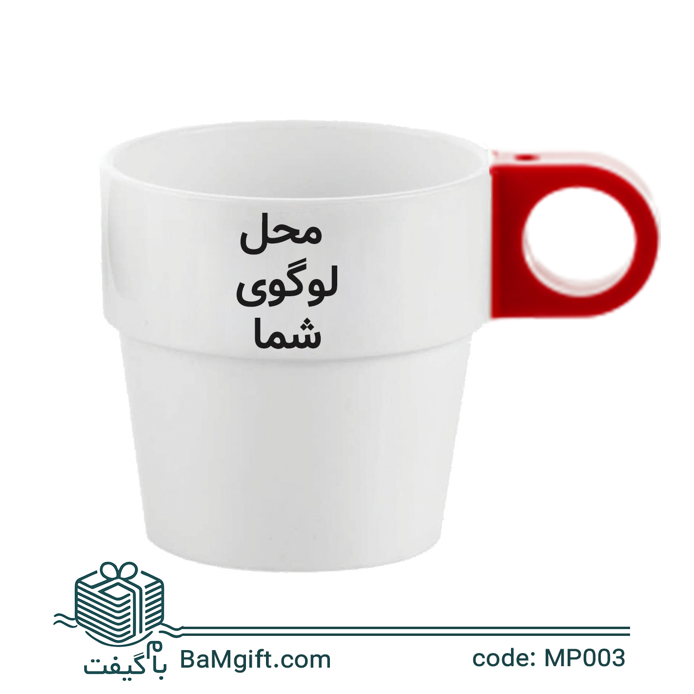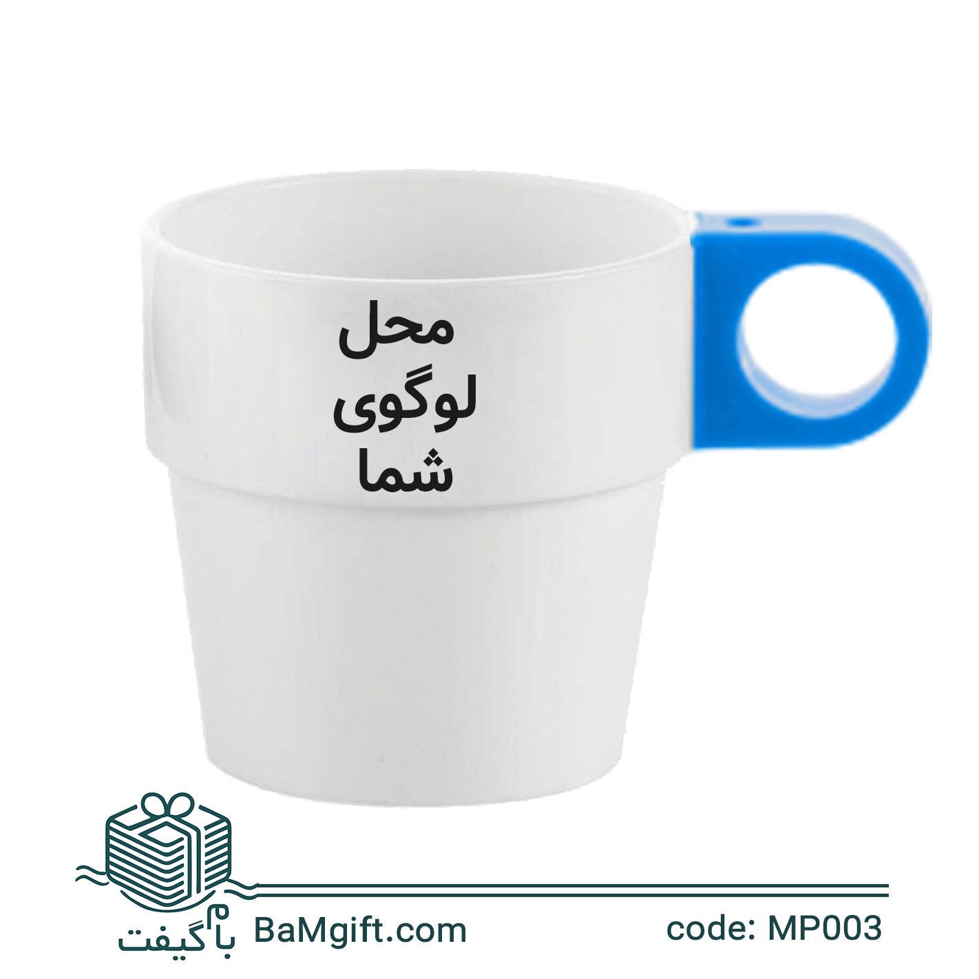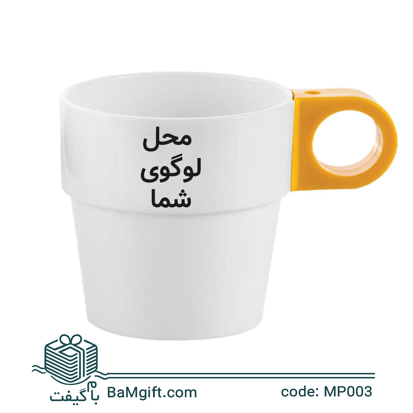 لیوان پلاستیکی تبلیغاتی سفید دسته رنگی | چاپ اختصاصی لوگو در 6 رنگ | MP003